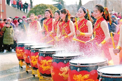 2月11日,在山东省青岛市崂山区王哥庄贺新春民间文艺展演活动上,社区居民表演《龙鼓闹春》。