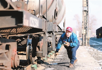 春运期间,吉林车辆段棋盘运用车间检车员加强车辆走行部、制动部检查力度,消除车辆配件脱落、缓解不良等安全隐患,全力确保春运旅客返程运输秩序安全畅通。 刘浩 摄