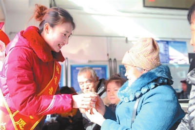 春运以来,铁路部门加大服务力度,从一杯热水、一句问候、一声祝福等细节做起,让旅客的回家旅途有了更多获得感。图为中国铁路西安局集团有限公司韩城车站客运人员为老年乘客提供一对一重点服务。 (李小刚 摄)