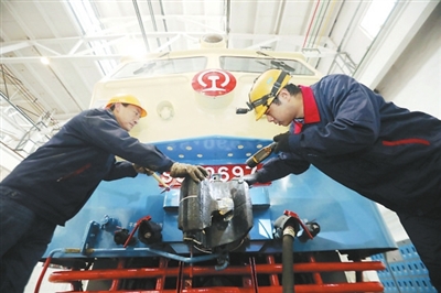 春运期间,宝鸡机车检修厂加快检修生产进度,严控机车走行部、车顶高压设备等关键部件质量,确保春运优质供车。图为该厂职工认真检查机车车钩技术状态,为即将上线运行的机车把好质量关。       (赵选团 摄)