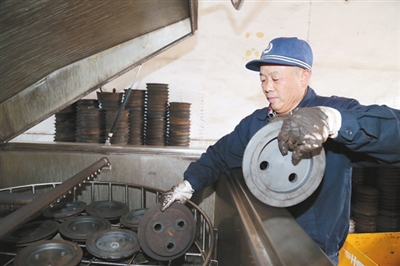 为确保列车运行安全,安康车辆段每天要对分解后的货车车辆轴承的前盖、后档、轴端螺栓等配件进行外观检查、清洗和检测。图为李国华在利用轴承配件清洗机蒸洗轴承前盖。  (周道刚 摄)