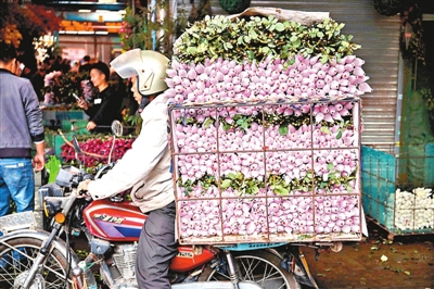 2月13日,广州岭南花卉市场,花农骑摩托车载着玫瑰花进入市场销售。