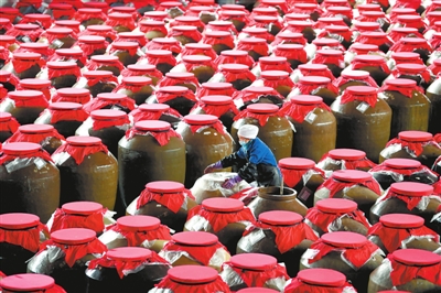 2月13日,在贵州省麻江县一家红酸汤生产企业,工人查看发酵中的红酸汤。