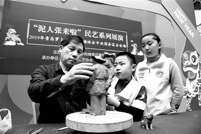2月14日,“泥人张彩塑工作室”艺人在活动现场制作泥人。
