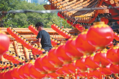 2月12日,在马来西亚吉隆坡天后宫,工作人员在检修红灯笼。为迎接元宵节,吉隆坡天后宫的工作人员检修红灯笼、更换灯泡,以营造火红的节日气氛。                                   新华社发(张纹综 摄)