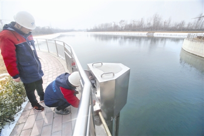 图为2月15日,河北邢台,在南水北调七里河排冰闸,工作人员正在巡检。