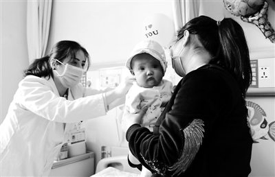 2月14日,医护人员在病房查看婴儿囡囡的恢复情况。