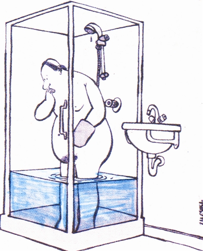 人在洗浴时身体至洁,渐入乐境。没想到下水道堵塞,顿时水漫至膝。“哇!淋浴房的质量太好了,一不留神变成浴缸”