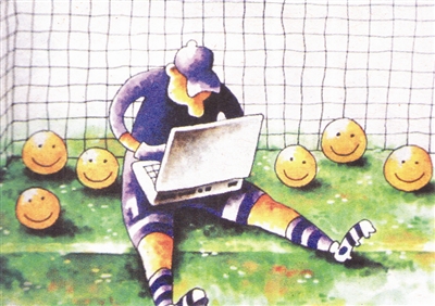 而今到处可见“低头族”,这位守门员埋头饱览屏幕上的精彩画面,岂不知皮球已进网内数粒。玩物丧志者可笑更可气!
