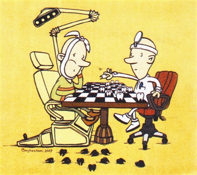 大夫为病人拔掉坏牙数颗,手术尽管十分成功,患者也疼痛难耐。好在医患关系和谐,就地取材摆起棋局苦中作乐。