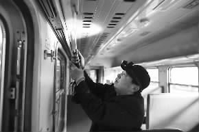针对节后返程客流高峰,西安客车车辆段合理组织生产技术力量,严格落实库内检修作业标准,加强既有客车走行部、电气装置等服务设施的维修力度,提高客车安全运行保障水平,为旅客提供安全、舒适的乘车环境。图为客车检修人员对入库列车的行李架进行紧固维修。(赵伯顺 摄)