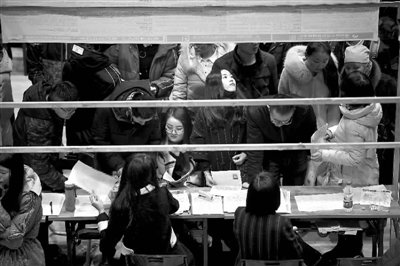 求职者在“银川都市圈春季大型人才交流会”现场咨询(2月16日摄)。