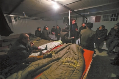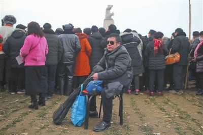 2月17日,一位盲人艺人在等待同伴办理到会艺人演出证,有了演出证就可以领取相关补助。