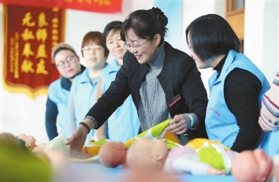 2月15日,在石家庄市嫂子家园职业培训学校,培训老师(右二)在给学员讲解育婴知识。