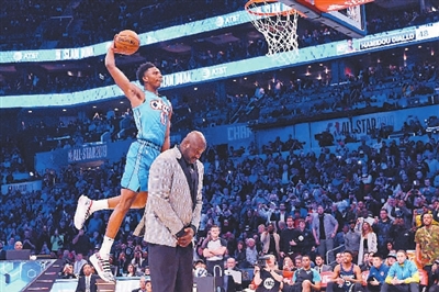 2月16日,在美国夏洛特举行的2019NBA全明星周末扣篮大赛中,俄克拉荷马雷霆队球员迪亚洛夺冠,成为新科“扣篮王”。图为俄克拉荷马雷霆队球员迪亚洛(上)越过奥尼尔扣篮。新华社/路透