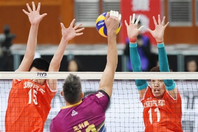 2月17日,在2018~2019赛季中国男子排球超级联赛决赛第一回合比赛中,上海金色年华男子排球队客场以3比0战胜北京汽车男子排球队,总比分暂时以1比0领先。图为北京队球员江川(右一)、王兆瑞(左一)在比赛中拦截上海球员朱利奥的扣球。