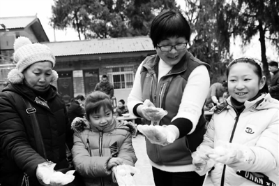 2月16日,在四川省巴中市通江县毛浴镇朝阳村,“童伴妈妈”杨玉兰在与留守儿童一起做游戏。