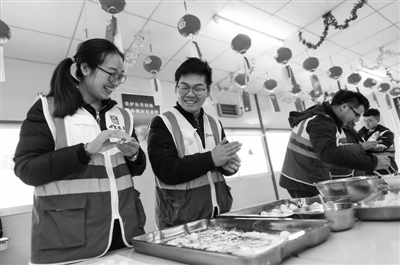 2月19日,武汉康宁机电项目工人在建设工地上一起包汤圆、煮饺子。