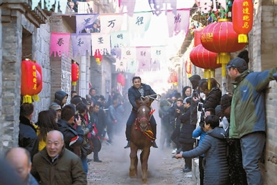 2月20日,一位村民在表演“跑马排”。当日是正月十六,山西省阳泉市平定县下董寨村举行传统民俗活动“跑马排”,村民们骑马在狭长的古巷里飞奔,吸引众多游客观看。