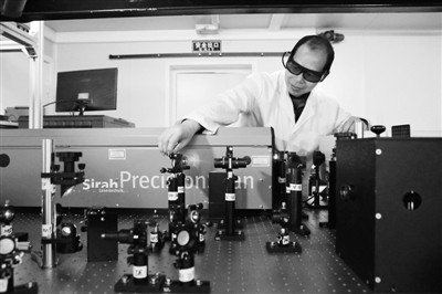 图为科考队员黄文涛在调整和优化光路。