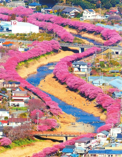2月20日,日本静冈县河津町,当地850株河津樱花盛放,如彩色绸缎装饰河岸美不胜