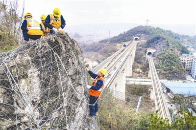 2月21日,贵阳高铁工务段工作人员在一处隧道上方处理危石(无人机拍摄)。