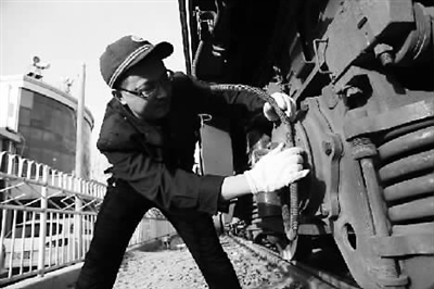每走几步就要弯腰鞠躬,一辆一辆检查所编组的列车车体,一列货物列车五六十辆,围着列车要检查一圈,钩销、风管等每一个细节都要看得清清楚楚,容不得丝毫马虎,一趟下来就是两三公里,弯腰近百次。