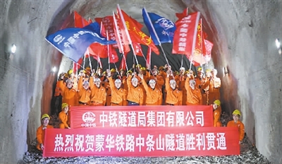 1月30日,中铁隧道局集团MHSS-3标中条山隧道施工人员庆祝蒙华铁路中条山隧道胜利贯通
