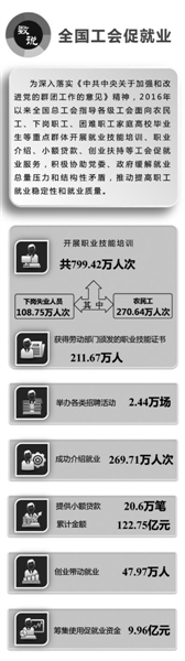 据统计,2016年以来,各级工会共开展职业技能培训799.42万人次;举办各类招聘活动2.44万场,成功介绍就业269.71万人次;提供小额贷款20.6万笔,累计122.75亿元,创业带动就业47.97万人;筹集使用促就业资金9.96亿元。
