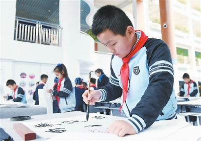 2月25日,广西南宁市滨湖路小学学生在开学日练习书法,接受传统文化熏陶。新华社记者 陆波岸 摄