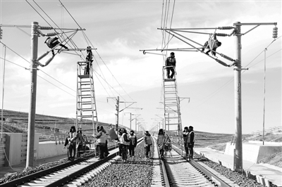 呼和浩特供电段对张呼客专、京包线的供电线路进行检修,全力确保春运期间安全稳定供电。   (于涵 摄)
