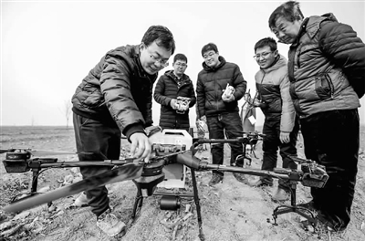 2月25日,在衡水市冀州区徐庄乡北榆林村,无人机教员(左一)为村民讲解植保无人机构造。