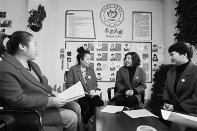 2月27日,织里镇“平安大姐”工作室的志愿者们在工作室里进行企业走访的分工安排。