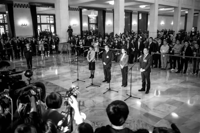 3月3日,北京人民大会堂东门内中央大厅北侧开启首场“委员通道”,全国政协委员吴伟仁、陈冯富珍、张云勇、海霞、余留芬、王宁利、宋纪荣、潘碧玲、施一公等走上通道,就探月工程、5G等热门话题回答记者提问。本报记者 王伟伟 摄