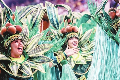 3月2日凌晨,在巴西圣保罗,桑巴舞校的演员参加狂欢节游行。