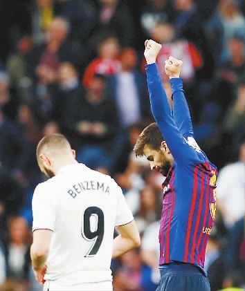 3月2日,2018~2019赛季西班牙足球甲级联赛第26轮比赛中,巴塞罗那队客场以1比0战胜皇家马德里队。图为巴塞罗那队球员皮克(右)在皇家马德里队球员本泽马身旁庆祝比赛胜利。     新华社/路透