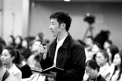 3月6日下午,全国政协第二场记者会在梅地亚两会新闻中心二层多功能厅举行。图为本报记者吴迪在提问。