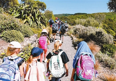 3月5日,在新西兰惠灵顿市郊的奥塔里-威尔顿公园,小学生们结伴徒步行走。