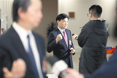 3月9日上午,在江苏代表团全体会议结束后,亨通集团有限公司董事局主席、党委书记崔根良(图中)代表接受记者采访。他认为,民营企业要发展,营商环境很重要,好的营商环境既靠政策,更靠法治,只有在法治环境下,企业家才会有信心。本报记者 杨登峰 摄