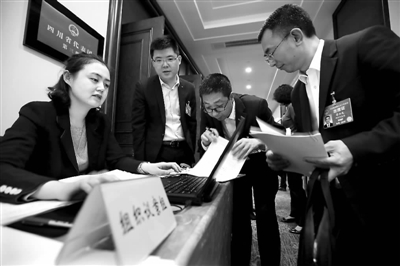 3月10日下午,川威集团成渝钒钛炼钢厂转炉车间副主任江勇(右二)代表在提交建议时说:“我再校一遍,看有没有遗漏。”当天,在四川代表团小组会议结束后,代表们纷纷将自己的建议和议案做最后的修改并提交。本次大会提交议案的截止时间为3月11日12时,因为第二天是代表休息日,大家选择提前递交。据工作人员介绍,今年两会是本届代表第2年履职,从已收到的建议和议案来看,数量和质量都有提高。