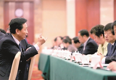 3月10日上午,在山东代表团全体会议开始前,山东兰田投资控股有限公司党委书记、董事长王士岭代表(图左)和后排的山东东明石化集团有限公司董事长李湘平代表一起交流扶贫的话题。王士岭代表说,统筹政策扶贫、社会捐助、志愿帮扶等各方扶贫力量,搭建统一的扶贫救助大数据平台,引导贫困群体和救助力量实现有效对接,切实兜好扶贫救助底线。 本报记者 杨登峰 摄
