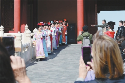 3月5日,在三八妇女节到来之际,一群建筑女工身穿清一色的古装出现在故宫博物院里,一边身临其境地游览,一边拍照留念,引来了很多游客驻足观看。本报记者 吴凡 摄