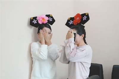 出发前画完妆后,两位女工模样大变,面对镜头捂住了脸。