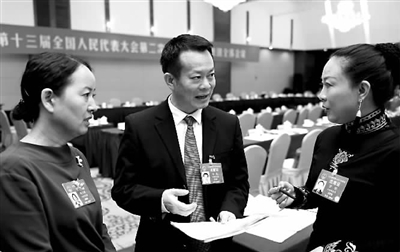 3月10日,李彪(中)在云南代表团小组会议间隙与代表交流。