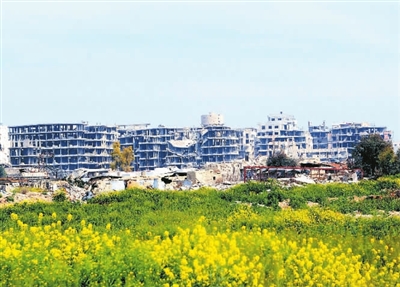 这是3月12日在叙利亚大马士革东古塔地区拍摄的春花和建筑废墟。