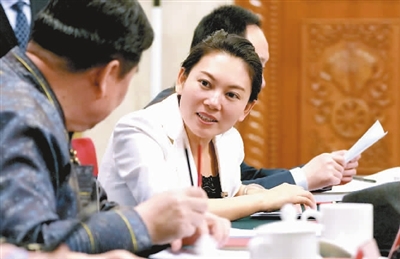图为王欣会在内蒙古代表团全体会议前与其他代表交流。