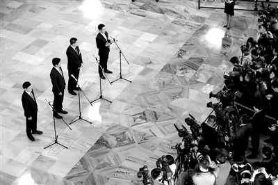 3月15日上午,十三届全国人大二次会议闭幕会开始之前,今年全国两会第三场“代表通道”如约开启,10位全国人大代表接受媒体记者采访,回应社会关切。本报记者 杨登峰 摄