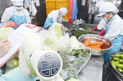 在韩国首尔一所学校的食堂内,为保证食材安全,工作人员正对食材测量辐射量。东方IC供图