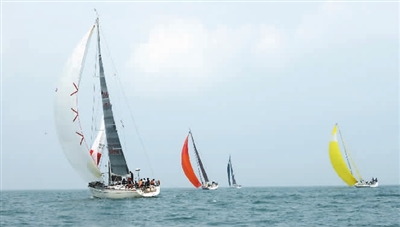 3月17日,2019环海南岛国际大帆船赛全环组海口到三亚离岸赛开赛。图为参赛船只在比赛中。                  新华社记者 杨冠宇 摄