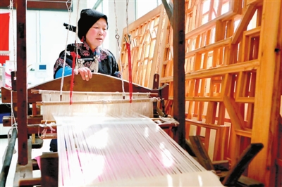 3月19日,贵州省锦屏县平秋镇平秋村妇女在利用传统织布机织布。